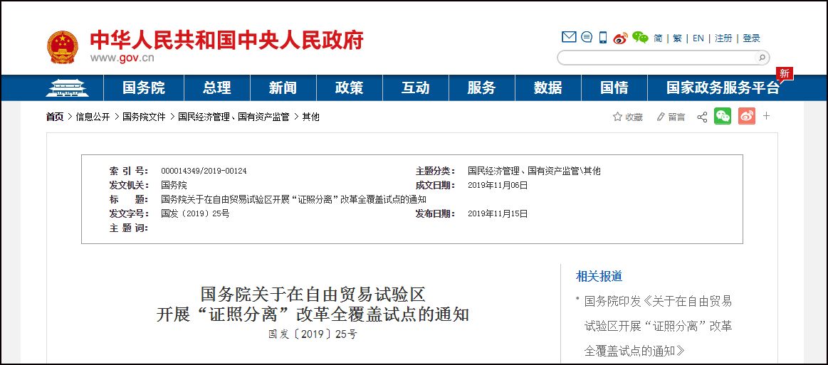 2019年11月15日 《国务院关于在自由贸易试验区开展“证照分离”改革全覆盖试点的通知》(国发〔2019〕25号)
