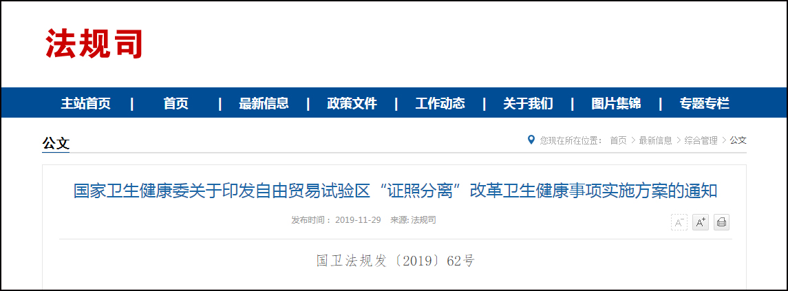 2019年11月29日 《国家卫生健康委关于印发自由贸易试验区“证照分离”改革卫生健康事项实施方案的通知》国卫法规发〔2019〕62号